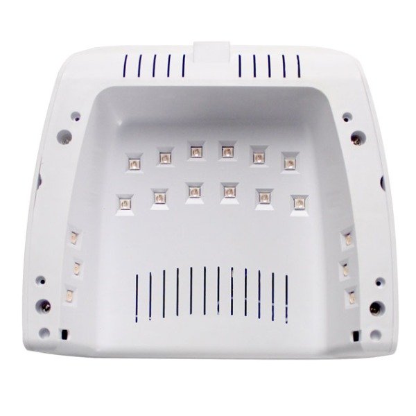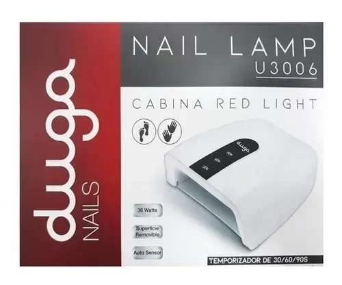 Cabina LED con potencia de 36 Watts. (Color Blanco). Doble fuente de luz (365 nm + 405 nm). 18 piezas LED colocadas estratégicamente. Entrada clasificada: 100V-240V 50Hz / 60Hz 12V / 1.5A Auto sensor de mano. Temporizador: 30s 60s 90s con indicador de luz. Parte inferior desmontable. Indicador de Luz de encendido.
